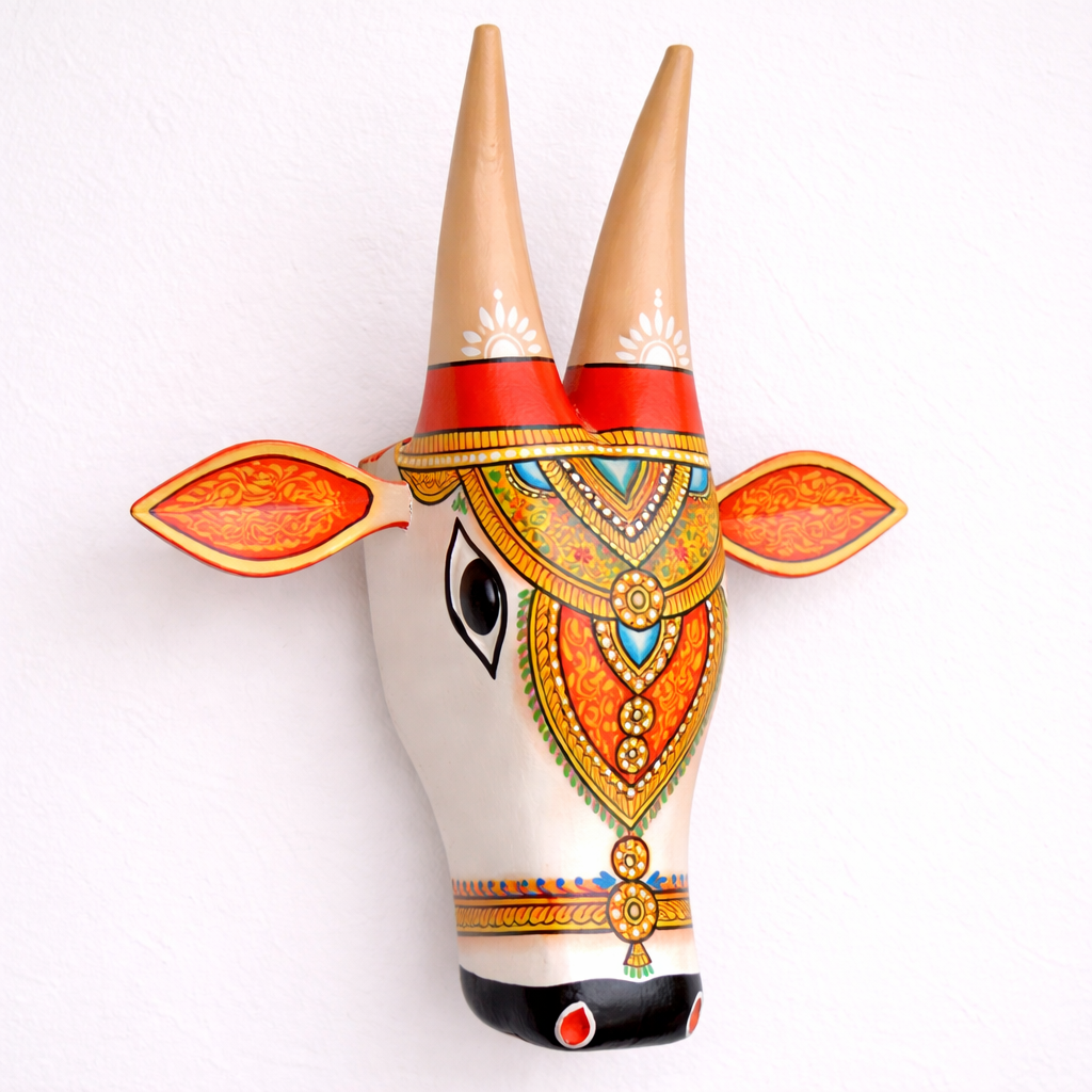 Hand painted Wooden Cow Head Wall Decor Set - Orange & White