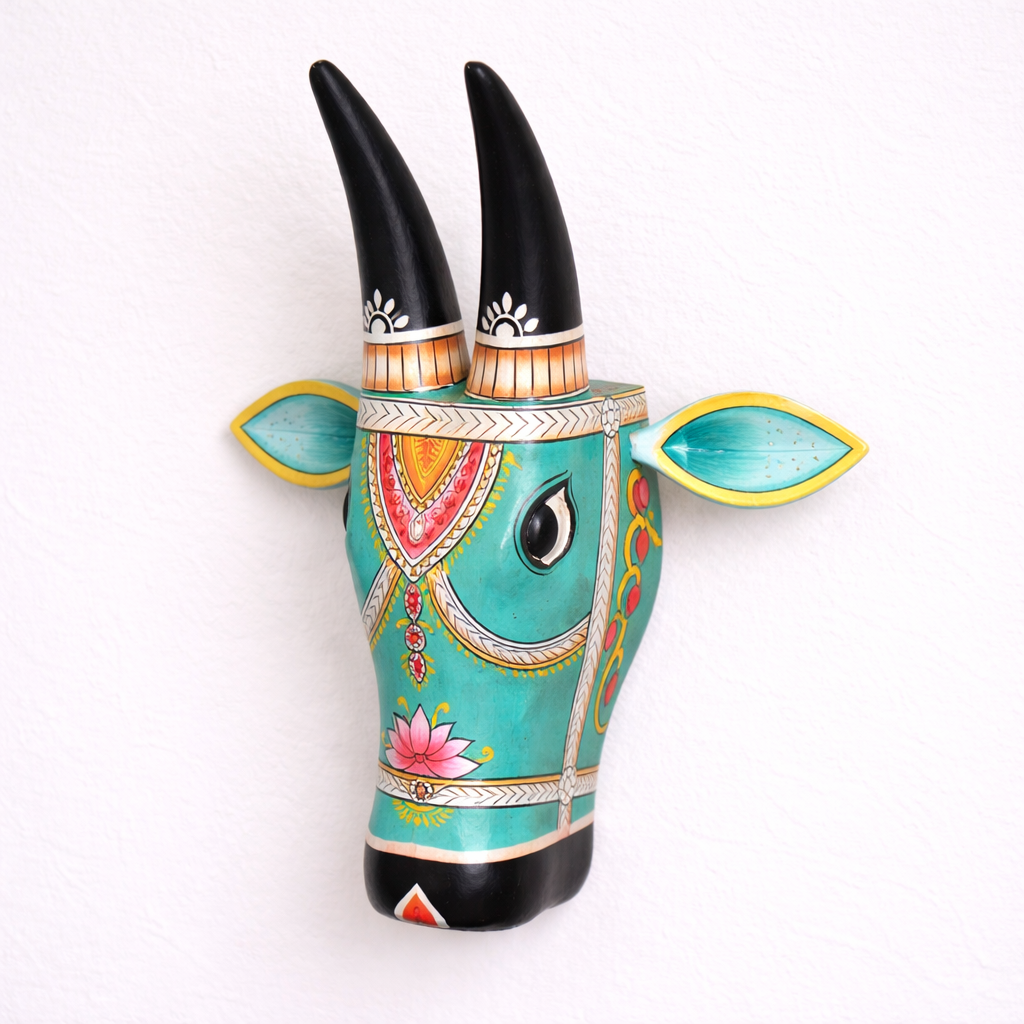Hand painted Wooden Cow Head Wall Decor Set - Turquoise