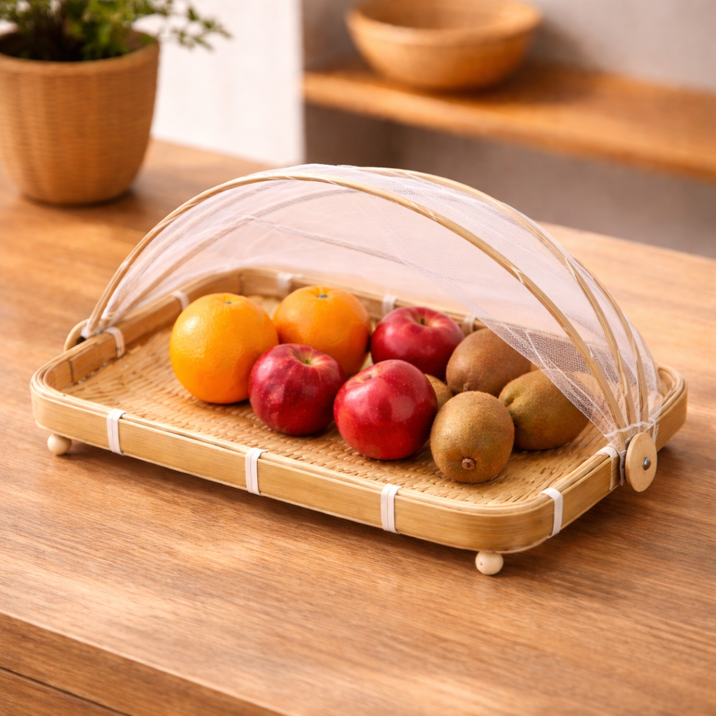 Handwoven Bamboo Square Fruit Tray with Cover Mesh